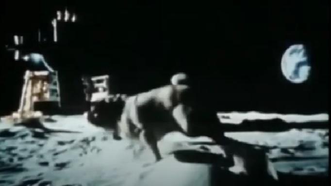 Erste deutsche Mondlandung. Mit einem Sechstel seines irdischen Gewichts setzt Pöhlmann elastisch im Mondstaub auf.